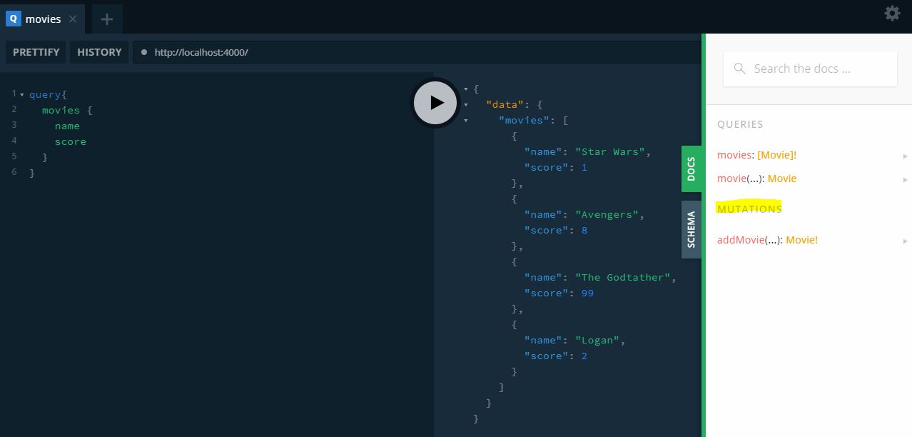 이처럼 플레이그라운드에서 쿼리로 movies 객체 안에 들어있는 데이터값들을 볼 수 있으며 mutations로 변형시킬 수도 있는 것을 DOCS에서 확인해볼 수 있다. Mutations으로 데이터를 추가할수도, 삭제도 가능하다.