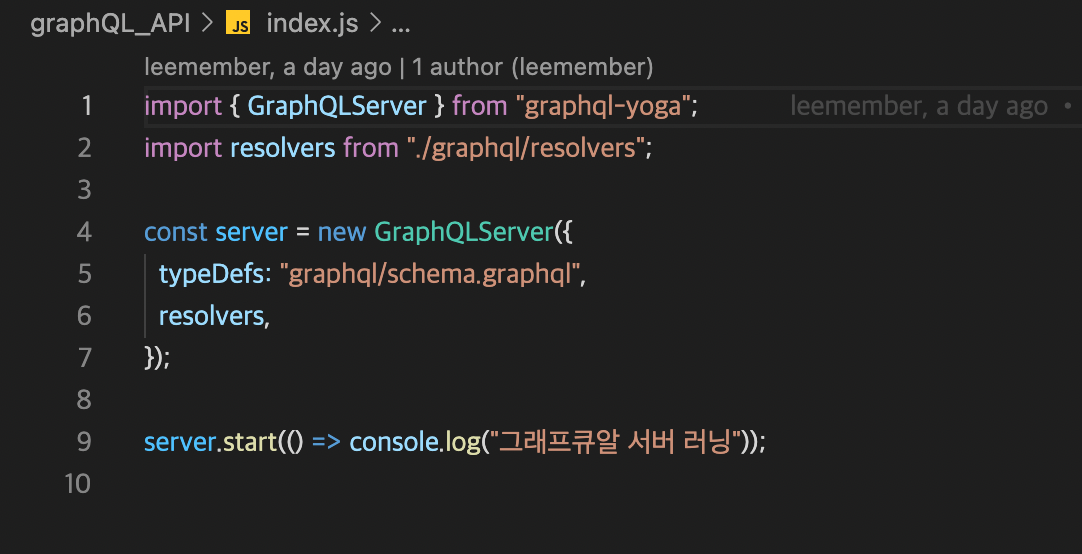 가장먼저 해줘야 될 것이 index 작업이다. graphql 세팅해주는 작업이고, 먼저 graphql-yoga 패키지를 설치해줘야 한다. 이걸 설치하는 이유는 그래프큐엘 요가에서 제공해주는 플레이그라운드로 데이터들을 불러오기 때문이다. 그리고 서버명과 resolver를 불러오고 서버가 실행되면 커맨드창에 표시되게 해주자