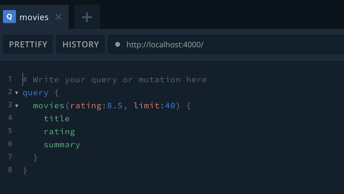 이제 스키마를 짜줘야한다. graphql은 정적인 타입 시스템을 사용해 데이터를 표현한다. 스키마 Movie에 들어갈 데이터들의 타입들을 정의해주는데, 여기서 쓰인 ! 느낌표는 서비스가 항상 값을 제공하겠다는 약속이다. 그리고 스키마를 짜주면서 동시에 resolvers도 같이 해줘야 한다.